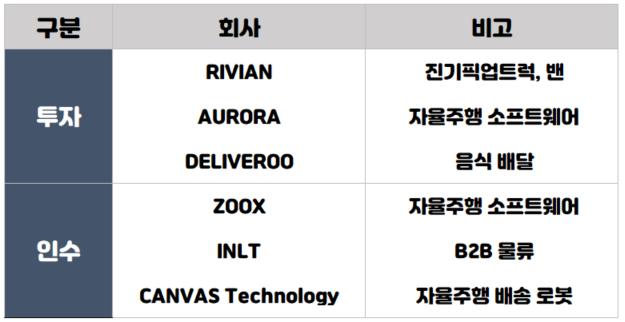 상장 후 쿠팡의 주가, 2021년 12월 1일 기준으로 아마존이 자율주행기술에 투자하는 이유 아마존은 물류비용 고민에 대한 답을 자율주행기술에서 찾고자 합니다. 리비안 외에도 ZOOX(자율주행소프트웨어), Canvas Technology(자율주행배송로봇) 등 자율주행 관련 다양한 기업을 투자 및 인수하여 독자적인 물류 생태계를 구축하고 있습니다. 리비안 역시 아마존의 물류 생태계에서 매우 중요한 역할을 합니다. 완전 자율주행기술이 적용된 리비안의 밴이 고객의 상품을 싣고 달리는 날이 생각보다 빠르게 다가올 수 있습니다.