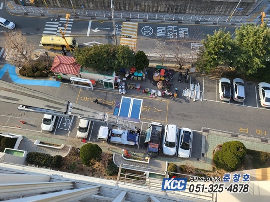 이렇게 기존의 새시를 철거하고 KCC 창호들로 저희가 제작한 제품을 사다리차로 들어올릴 준비를 합니다.