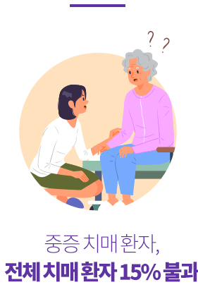 치매에 대한 부정적 인식과 죄책감, 비난에 대한 두려움 때문에 여전히 치매 발병을 가족들에게 알리지 못하는 경우가 많습니다. 많은 분이 치매 환자라고 하면 가족을 몰라보고 대소변을 구별하지 못하는 중증 치매 환자를 떠올리지만, 실제 중증 치매 환자는 전체 치매 환자의 15%에 불과합니다.