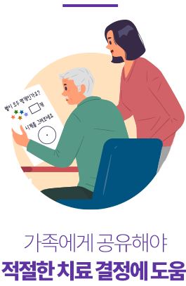 반면 알츠하이머병 환자의 가족은 알츠하이머병 환자가 어떤 증상을 보이는지를 알기 때문에 기억력 저하 등 알츠하이머병 초기에 나타나는 증상을 단순 노화현상으로 보지 않습니다. 따라서 알츠하이머병 진단에 필요한 평가를 적절한 시점에 받아 조기에 알츠하이머병을 진단하고 적극적으로 관리할 수 있습니다.