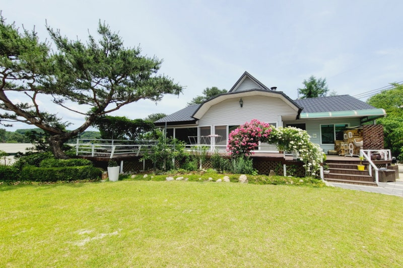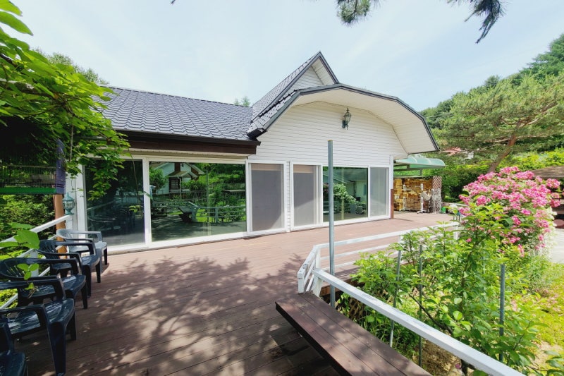 가평독채펜션의 넓은 거실에서 모두 모여 이야기를 나누는 것도 좋고, 큰 창문으로 넓은 정원이 한눈에 들어온다.그냥 놀러온 사람들만 있는 공간이라 우리집처럼 편안하게 지낼 수 있어요~ 한적한 곳에서 편하게 여행할 수 있는 곳이에요!