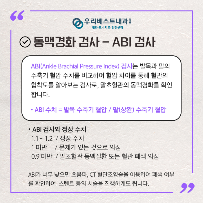 ABI 검사는 발목과 팔의 수축기 혈압 수치를 비교하여 혈압의 차이에서 혈관의 협착도를 조사하는 검사입니다.ABI 검사는 말초 혈관의 동맥 경화를 조사할 때 사용을 합니다.