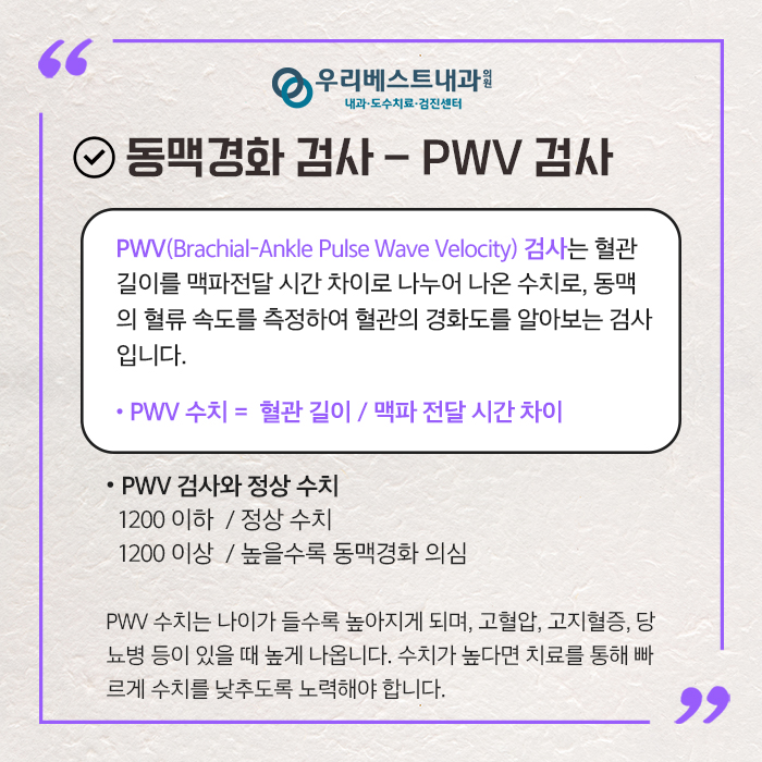 PWV 검사는 혈관의 길이를 맥파 전달 시간차로 나눈 수치로, 동맥의 혈류 속도를 측정하여 혈관의 경화도를 조사하는 검사입니다.