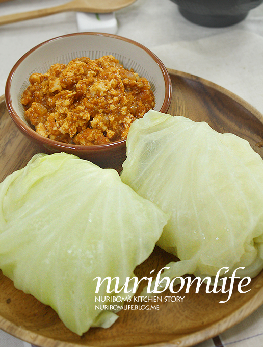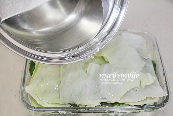 양배추를 미지근한 물 5컵 : 굵은 소금 3큰술씩 담근 후 물기를 뺀다(중간 중간에 저어 고르게 절인다)