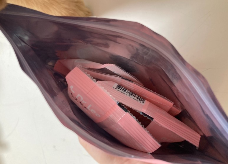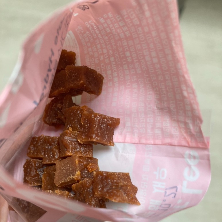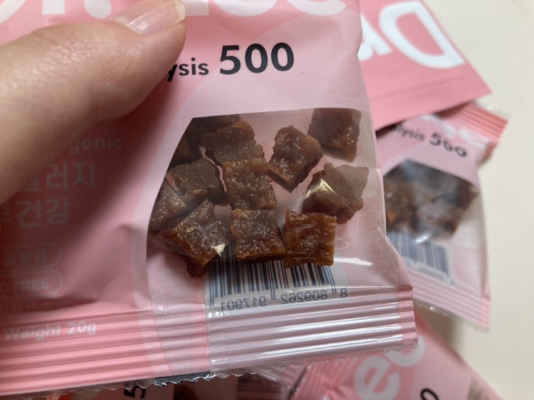 큰 파우치 모양의 포장 속에 개별 포장이 들어 있는 것도 마음에 들었다. 이런 쫄깃한 간식은 개봉 후 관리가 제대로 안 되면 딱딱해질 수 있기 때문에 개별 포장이 중요하다. 파우치 1개에 5봉지가 들어 있다.