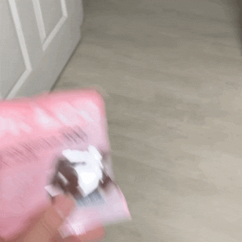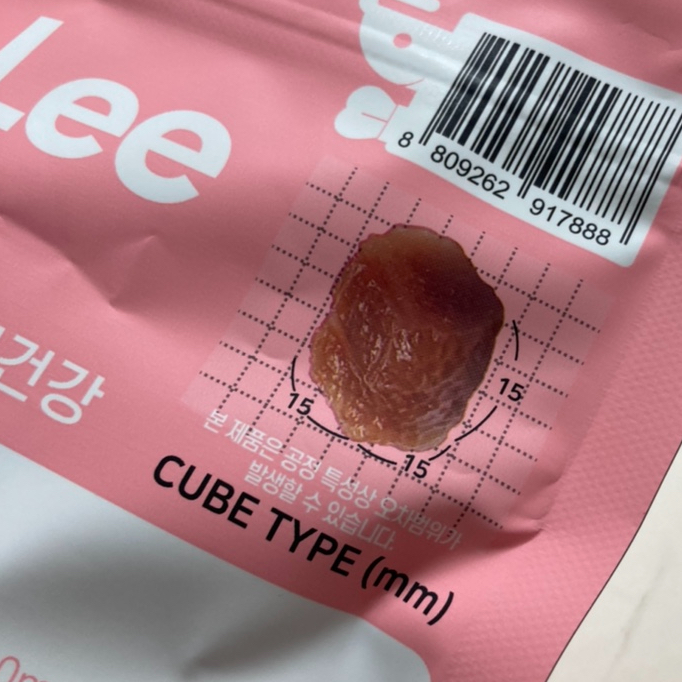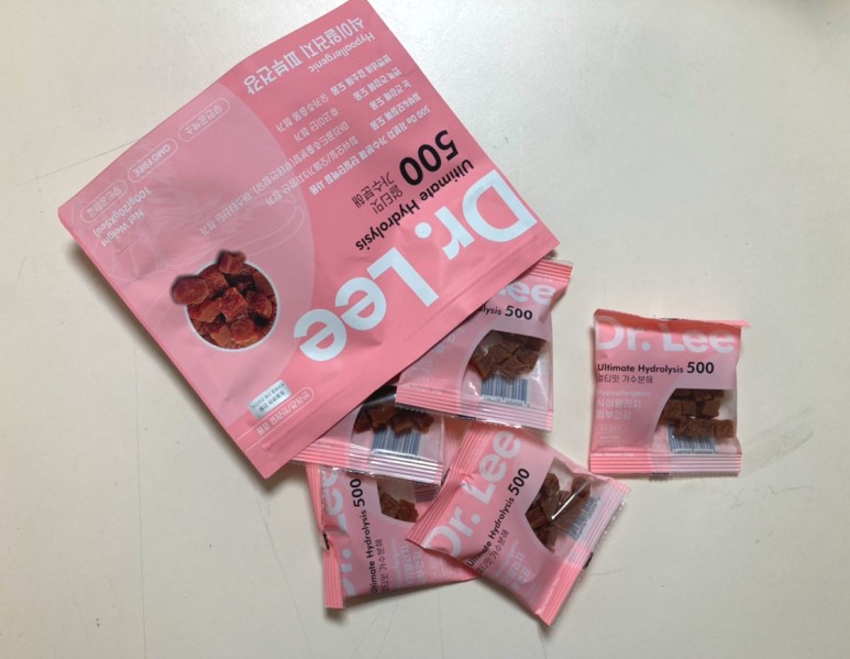 봉지는 이처럼 간식의 상태나 개수를 눈으로 확인할 수 있도록 디자인되었다. 간식은 작은 큐브 모양으로 되어 있고, 반려동물에게 주는데 편할 것 같다.
