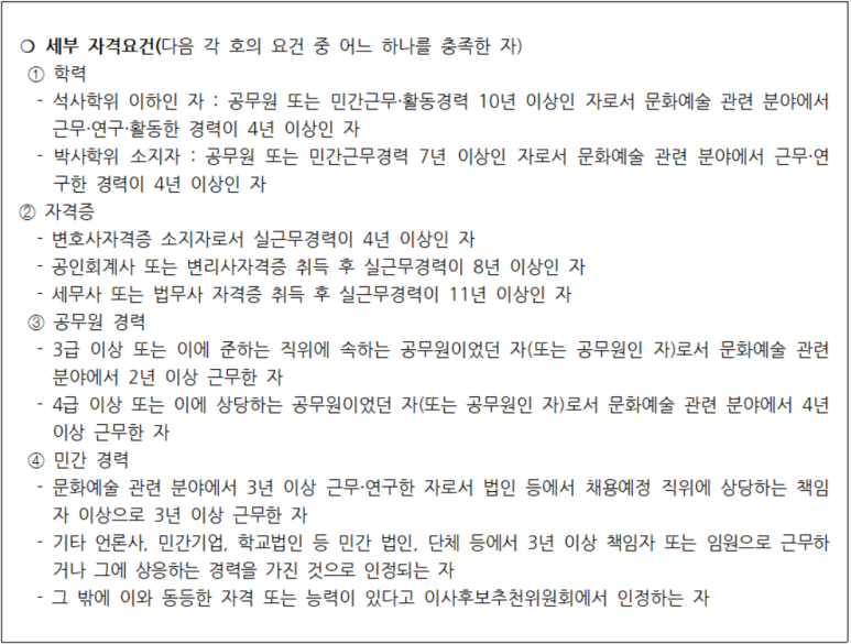 응모자격은 ▶문화예술분야와 관련된 전문적인 지식과 덕망을 가진 자, ▶지역문화예술 발전을 위한 공헌을 가진 자, ▶재단업무 및 운영에 관한 학식과 경험이 풍부한 자, ▶기타 이와 동등한 자격 또는 능력이 있다고 인정되는 자 등이다.