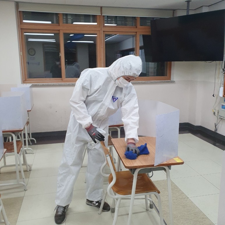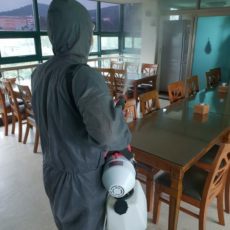 딱딱한 표면을 소독하면서 천으로 닦아내는 모습입니다. 평택소독업체, 평택 방역업체로서 20년 노하우를 가지고 있습니다. 필요한 부위는 다음과 같이 초미립자 분무 소독으로 확실하게 소독할 수도 있습니다.