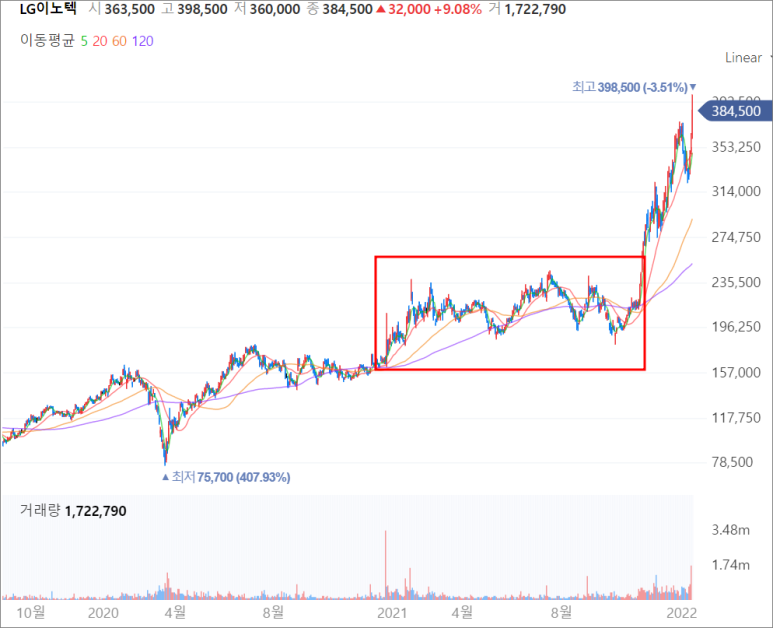 기억하면 올해 지난해보다 100% 오른 LG이노텍도 지난해 11월 전까지는 박스권에 들어 주가가 부진했다.