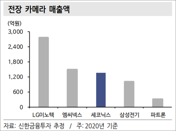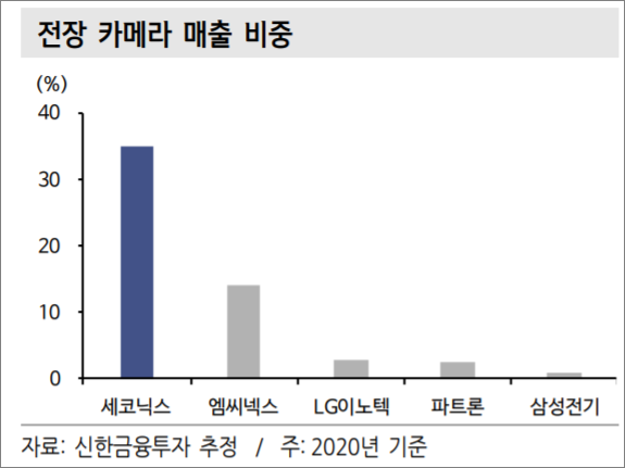 세코니쿠스가 전장 카메라 매출 비중이 약 35%를 차지해 가장 전장 매출 비중이 높은 회사로 꼽힌다.