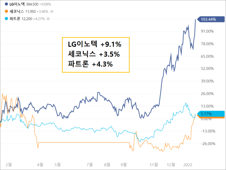 전장 카메라 관련주는 모두 주가 상승이 좋았다.특히 전장카메라 대주주인 LG이노텍은 연일 주가 상승에도 불구하고 오늘 하루 만에 +9% 상승했다.