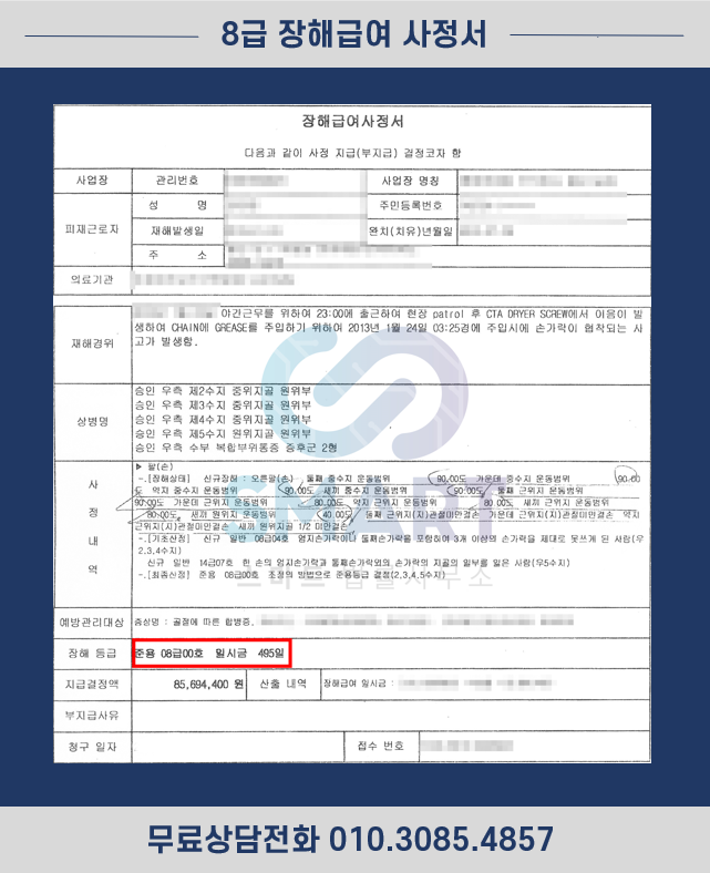 장애점수는 앞서 말씀드린 진단기준에 해당하는지 여부 점수와 아래 치료방법에 대한 점수를 합산한 점수로 산출합니다. 치료방법에 대한 점수는 서로 다른 판정을 받은 각각의 치료방법(같은 치료방법을 반복적으로 받은 경우 포함)에 대한 점수를 모두 더한 점수로 하며, 모두 더한 점수는 4점을 초과할 수 없습니다.