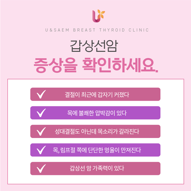 갑상선암은 초기에는 특별한 증상이 없는 경우가 많아 검진으로 발견하는 경우가 대부분인데요.단, 목 앞부분에 딱딱한 응어리가 닿는 경우, 성대결절도 아닌데 목소리에 변화가 생긴 경우, 음식 삼키기가 어려운 경우, 최근 갑자기 결절이 커진 경우, 계속 피곤한 경우 등 이중으로 해당하는 사항이 있으면 갑상선암을 의심해볼 수 있으니 내원하셔서 정확한 진단을 받아보시기 바랍니다.