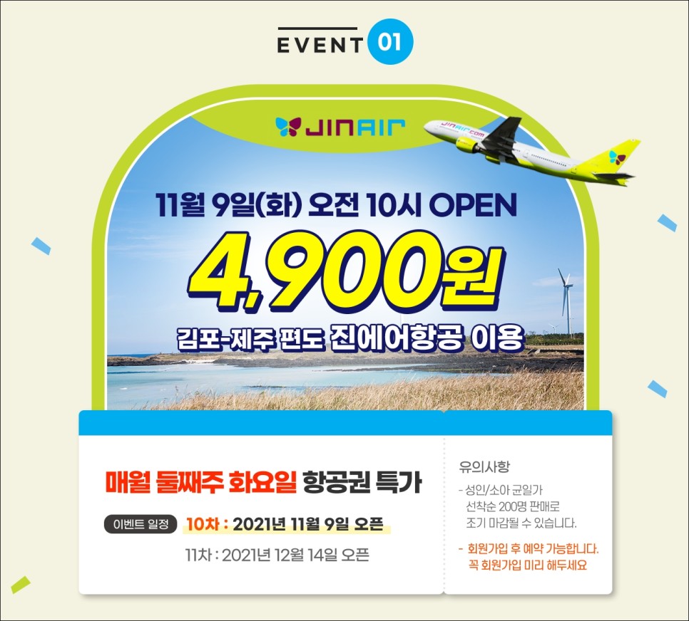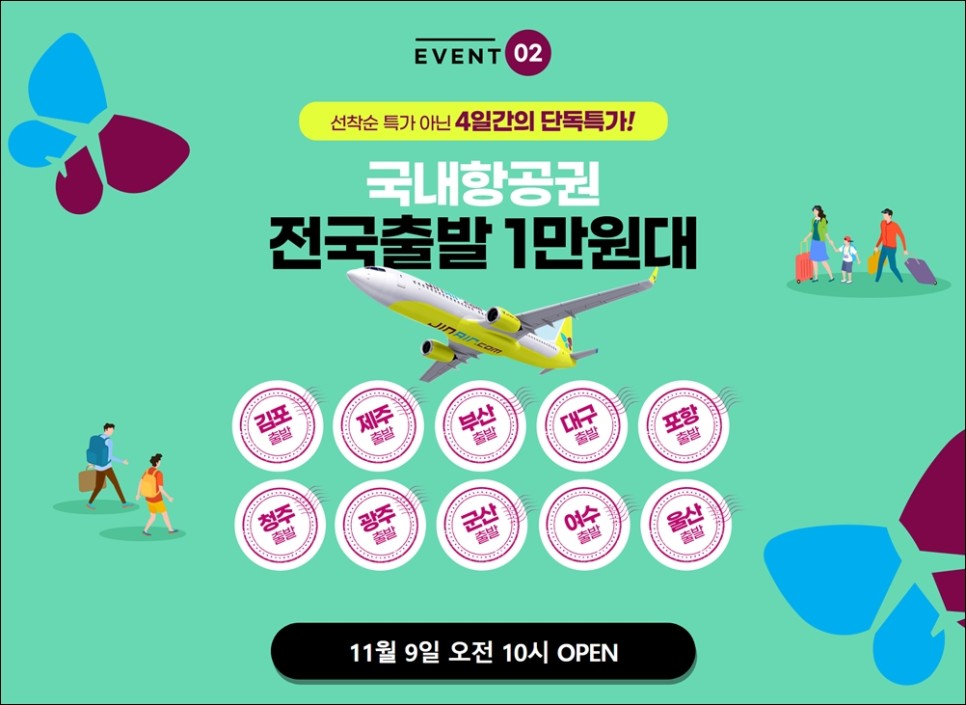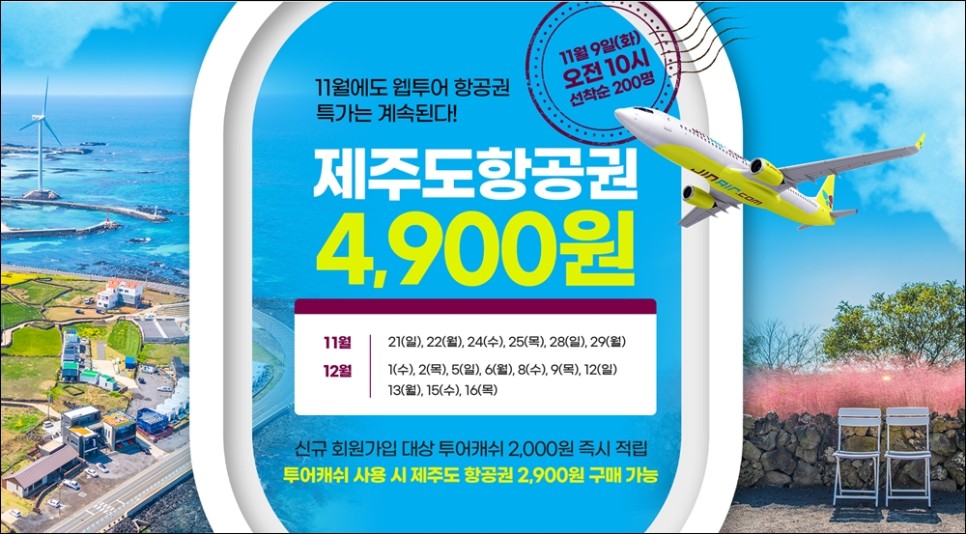 <웹투어 제주항공권특가> 언제:11월 9일(화) 오전 10시 어디서나:웹투어 가격:편도 <항공사:진에어