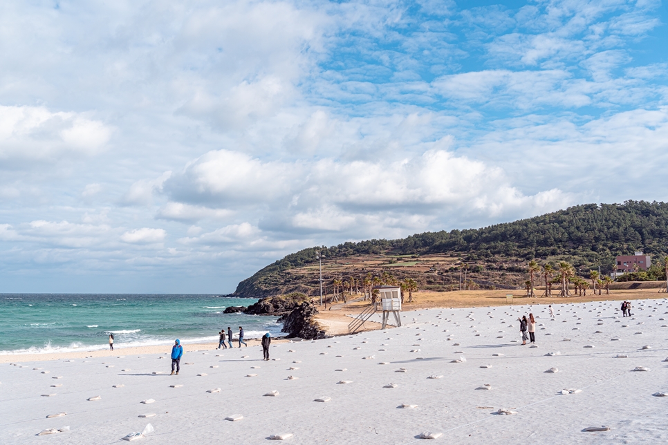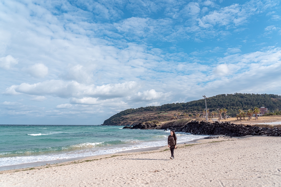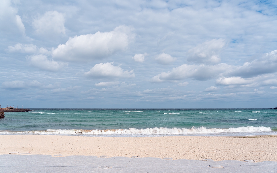 맑은 날에는 해변을 벗어날 수 없어요. 이날 함덕해수욕장에 갔는데 바다 색깔이 굉장히 예뻤어요. 모래사장 위에는 뭔가가 깔려있었는데.. 아마 강풍에 모래가 날리지 않도록 막아둔 것 같아요. 바람이 정말 많이 불었거든요.