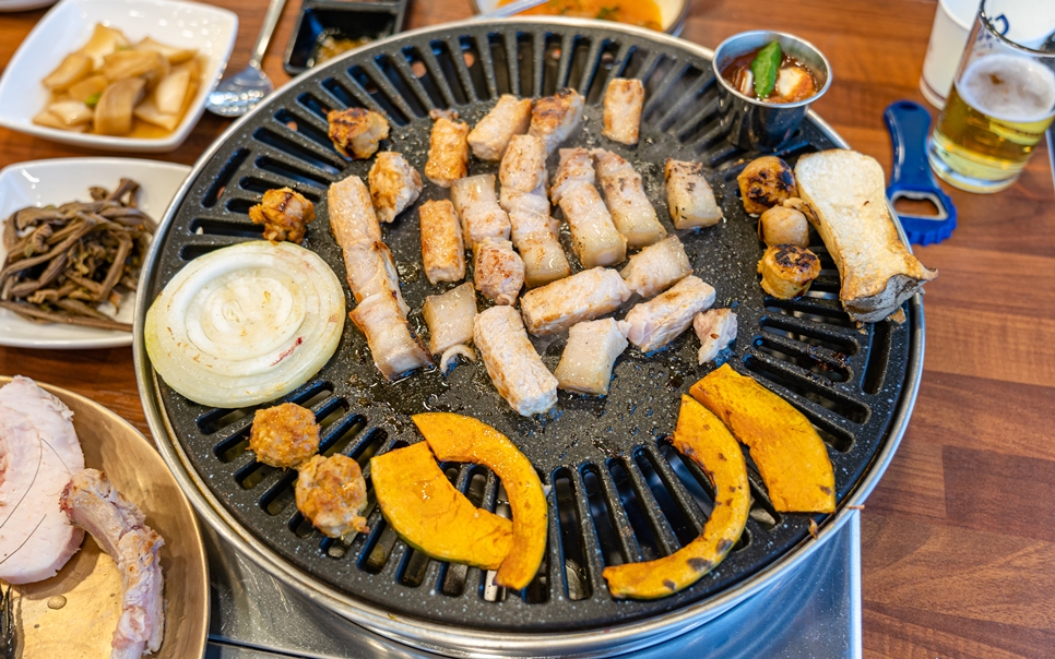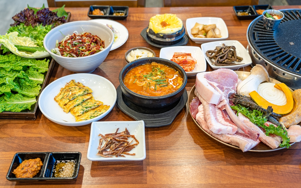 반찬도 되게 잘 나오는데 특히 찌개랑 파랑 계란찜이 맛있었어요 계란찜은 위에 치즈랑 잼을 올리는데… 서로 안 어울리는 것 같은데 지인~ 정말 맛있어요 잼이 올라가는 게 신의 한 수.흑돼지는 말할 것도 없이 완벽했어요. ^^