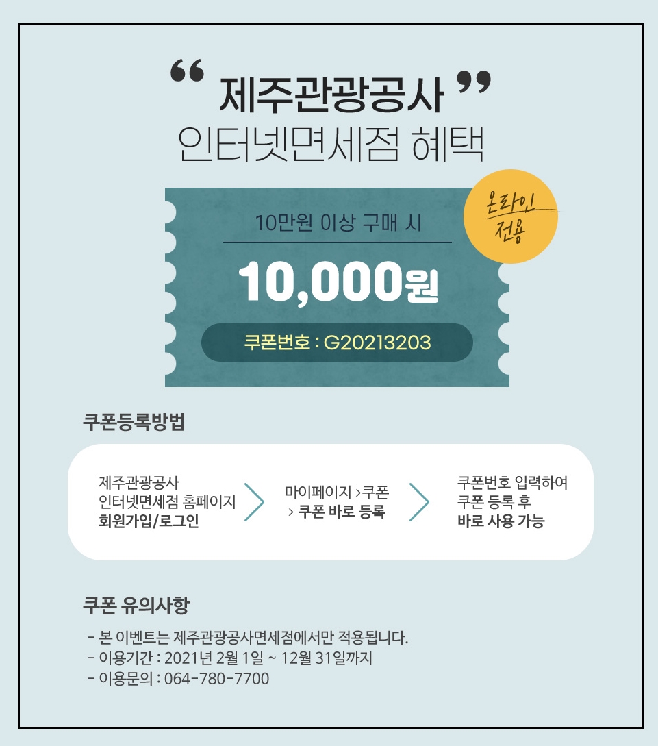 오프라인 뿐만 아니라 인터넷 면세점의 혜택도 있습니다. 온라인 전용으로 ᅵᅡ 이상 구매 시 ᅵ ディスカウント 할인 받으실 수 있습니다.