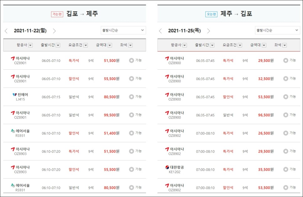 11개 항공사의 리얼타임 항공권 예약 시스템도 갖추고 있어 제주도 항공권의 특가 비교가 가능합니다. 아래와 같이 왕복이 시간대별로! 나오기에 정말 편합니다 상부의 역삼각형을 누르면 필터의 정렬도 가능합니다!