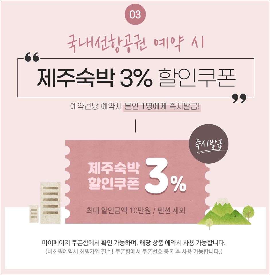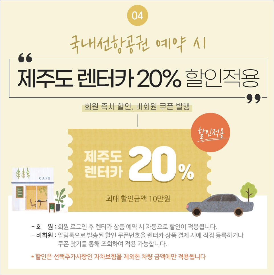 제주도 항공권과 함께 제일 먼저 준비해야 하는 게 숙소와 렌터카인데 이 부분에 대해서도 할인쿠폰을 준대요. 숙박은 3% OFF, 렌터카는 20% OFF입니다. 모두 최대 할인 금액은 ᅵᅧ이며 숙박은 펜션 제외입니다. 호텔이나 리조트 가능!