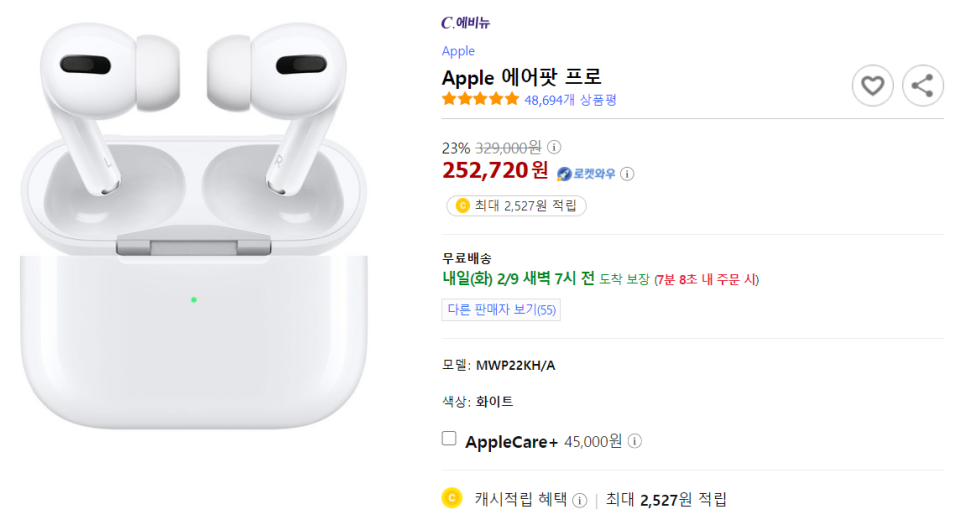 저는 쿠팡에서 구입했어요 애플의 공식홈에서 구입하는 것보다 저렴하고, 정품 보장이 되기도 하고, 로켓배송도 되기 때문에, 별 고민 없이 구입했습니다!