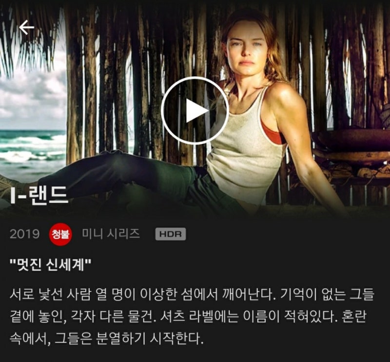 2019년에 개봉한 작품인데 용의 장르는 SF, 미스터리물인데 사실 미스터리는 아니에요. 넷플릭스 미드 추천 i랜드는 음, 여러 작품이 짬뽕된 느낌이라는 평가가 많은데 연 대표적으로 언급되는 게 로스트인데 제가 로스트를 안 봐서 개인적으로는 헝거게임이 생각났어요.연나탈리 마르티네스, 케이트 보즈워스 등 좀 인지도 있는 배우들이 출연합니다.