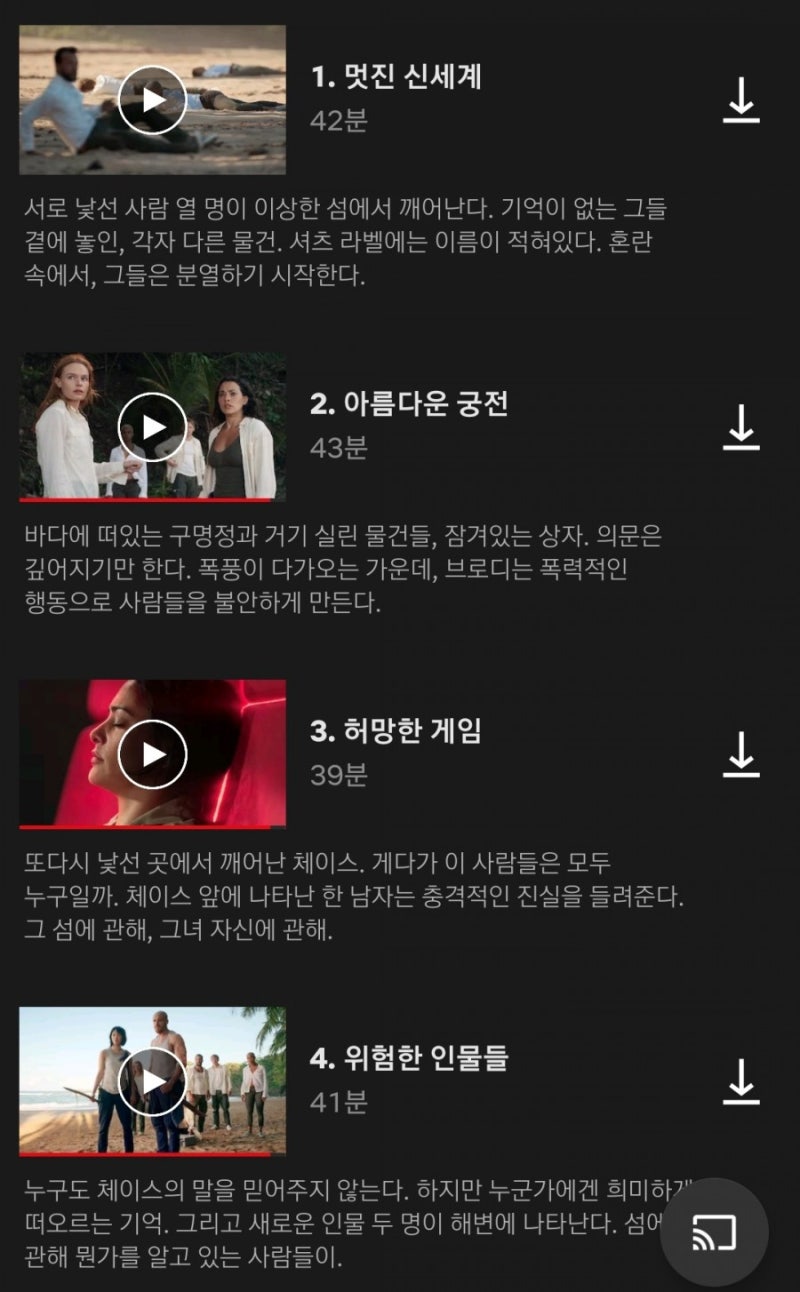 흠, 여기는 무인도인가 봐요.이름도 모르고 기억을 잃은 남녀 10명이 존재합니다.그들의 옷차림도 많이 비슷해서 워크샵에 오는 길에 사고가 났는지 추측하고 있을 때 아까 적대적인 금발의 여자가 사람마다 셔츠 안쪽 태그에 이름이 있다는 걸 알았어요.그러다 일단 서로의 이름은 알게 됐는데 일단 주인공 이름은 체이스였어요.그렇게 체이스가 남자1과 사람들이 누워있던 곳에 있는 물건도 찾고 섬도 둘러보는 동안에