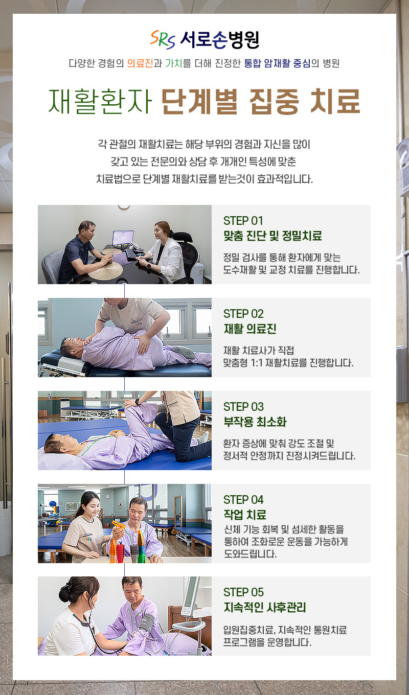 특히 청주 오십견 솔로손병원에서는 무중력 감압기, 고주파 온열기 등의 특수 장비를 도수치료와 함께 사용하여 환자의 통증을 보다 효율적으로 완화할 수 있도록 합니다. 이러한 도수치료는 환자의 증상과 신체적 특성에 맞게 강도를 조절하는 등 물리치료사와 환자의 1:1 맞춤형으로 이루어집니다.