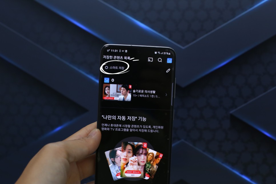 저장한 콘텐츠 목록 페이지 입니다. 다운로드한 영상을 여기서 확인할 수 있습니다.8. 그리고 화면 상단에 보면 스마트 저장이라는 메뉴가 보여요! 팁을 하나 더 알려드릴게요.메뉴를 터치해 주세요!