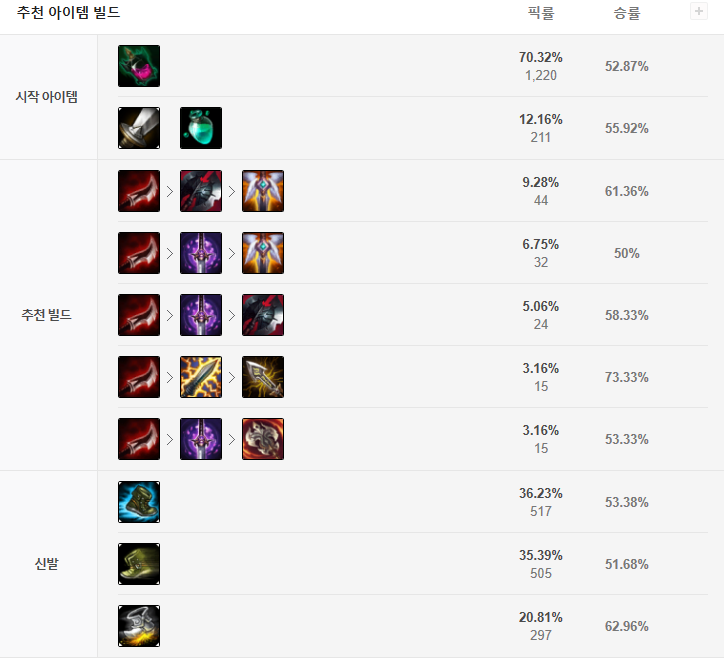 룬은 정글녹턴과 같은 룬을 가집니다치명적인 스피드와 침착성, 궁극의 사냥꾼을 들어올려 궁극의 쿨타임을 최소화하는 모습입니다.