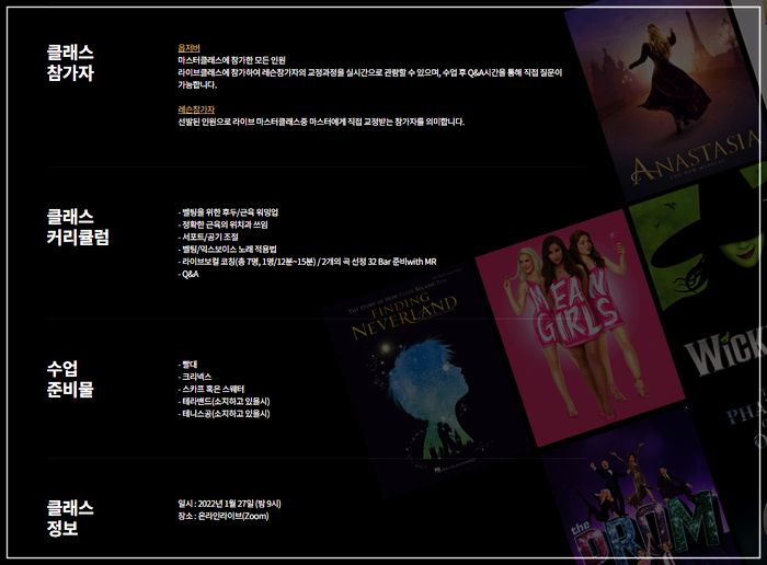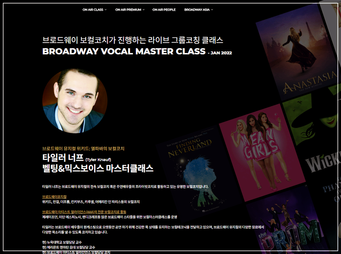국내 최초로 브로드웨이 보컬 코치가 갖는 라이브 그룹 코칭 클래스에서 브로드웨이 뮤지컬 위키엘 파바의 보컬 코칭 타일러냅의 벨팅 & 믹스 보이스 마스터 클래스를 진행한다.