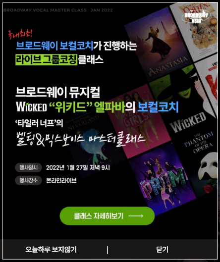 문화베이팅센터 홈페이지에 새로운 정보를 얻을 수 있으니 참고하자.지난 브로드웨이 마스터클래스 <브로드웨이 뮤지컬 알라딘의 주연배우 이사벨 매켈라와 함께하는 클래스>에 참여했던 경험으로 뮤지컬 지망생이나 미국 유학을 준비하는 학생 등에게 동기부여를 하는 등 도움이 되는 클래스로, 이번 브로드웨이 보컬 코치가 직접 진행하는 라이브 그룹 코칭클래스도 직접 브로드웨이 뮤지컬 한 편을 보는 새로운 경험이 될 것으로 보인다.