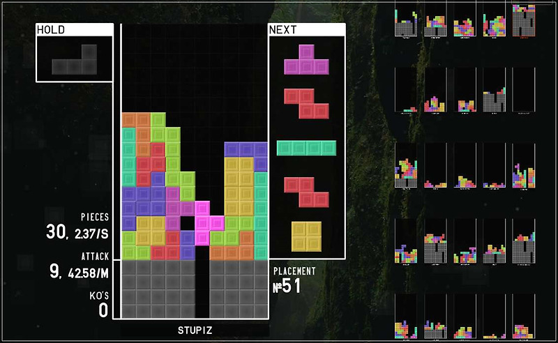 조작 방법은 좌우 방향 키로 이동하고, 상방향 키로 회전하며, 하방향 키로 블록을 내립니다. 또한 공간의 바로 블록을 바로 닫을 수 있으며, 시프트 키로 블록 하나를 저장 또는 꺼낼 수 있습니다. 이제는 테트리스 조각을 움직여 하단에 쌓아 올리고 위와 같이 한꺼번에 많은 블록을 파괴하기 위해 노력해야 합니다. 가로줄에 빈자리가 없도록 블록을 쌓아 없애고 최대 4열 블록을 한꺼번에 없애 고득점을 기록할 수 있습니다.