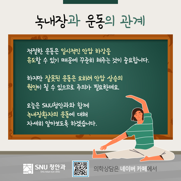 오늘 #보라매 동안과 #SNU청안과 함께 녹내장 환자의 운동에 대해 자세히 알아보도록 하겠습니다.