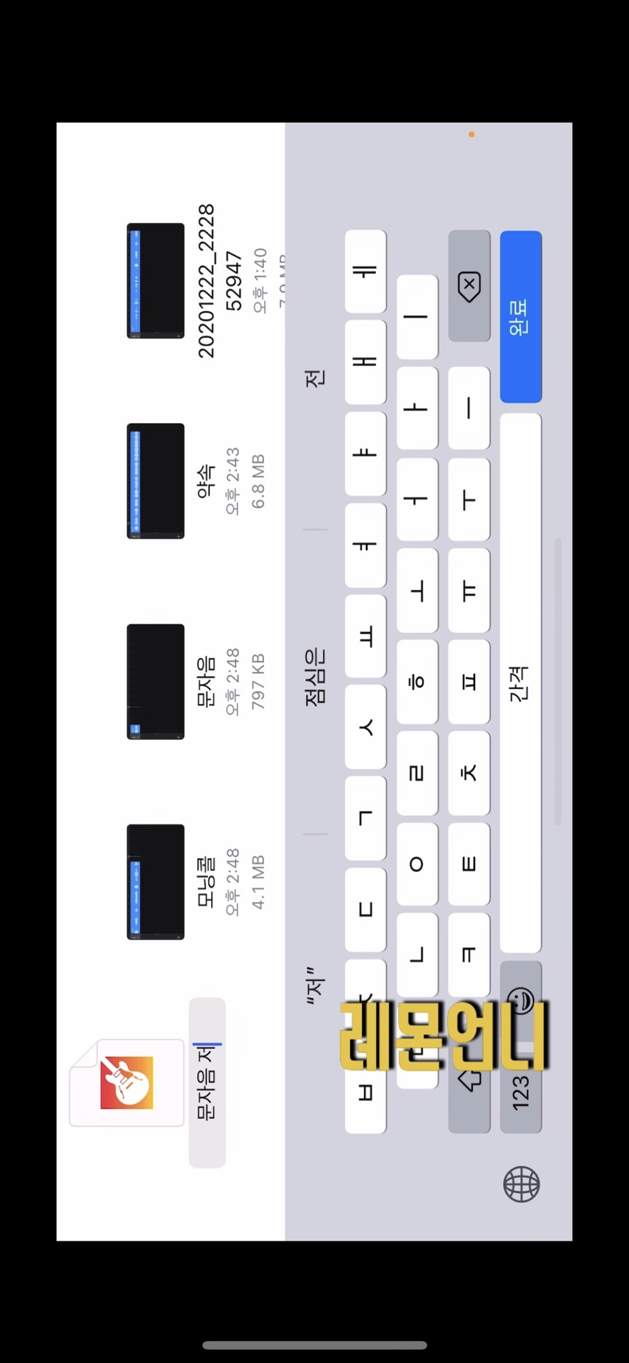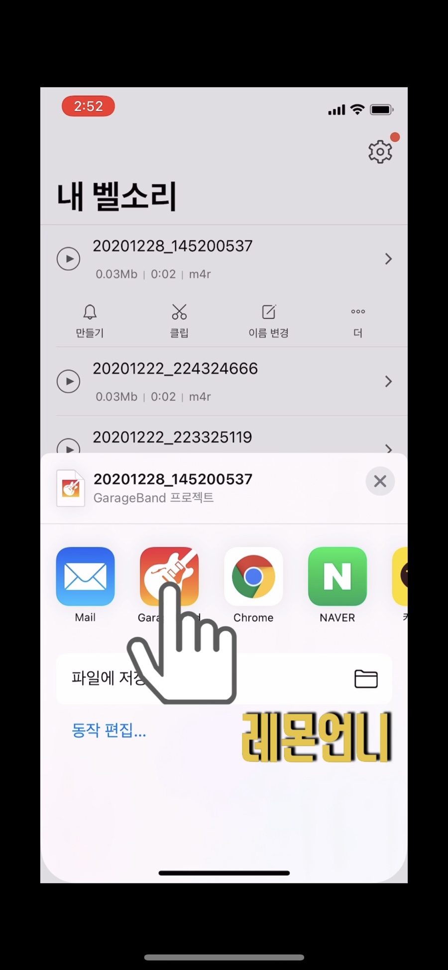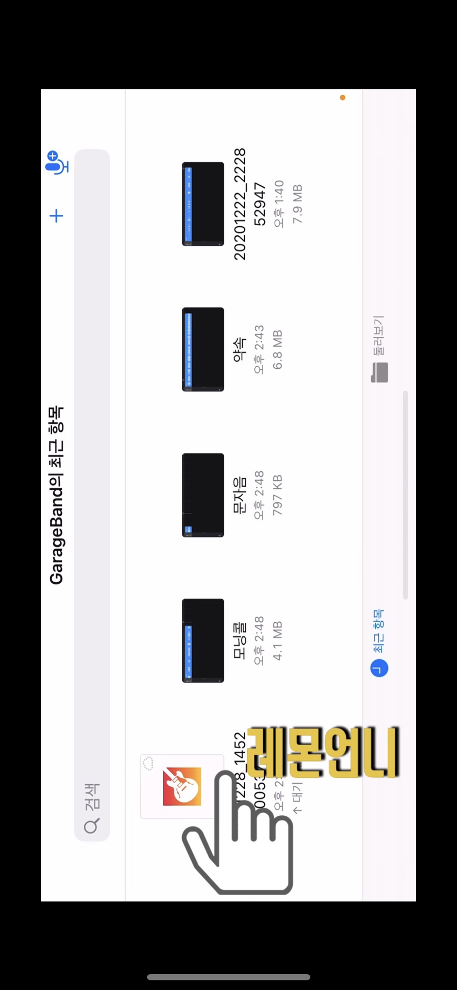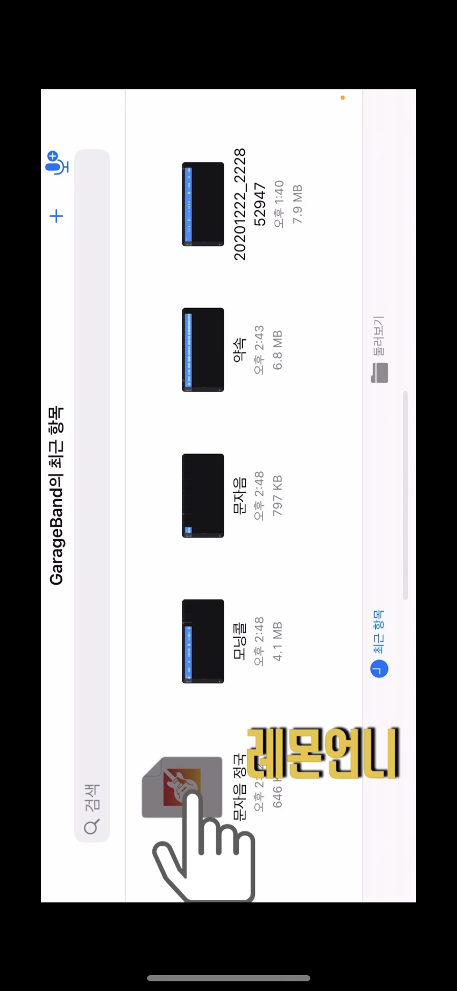 차고 밴드에 접속하면 가장 왼쪽에 복사한 파일이 표시됩니다.먼저 알 수 없게 될지도 모르기 때문에 파일명을 바꿔 보겠습니다.길게 누르면 우측에 이름 변경이 나타납니다 파일명 -> 문자음정국