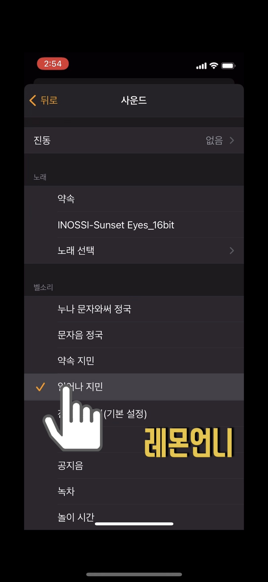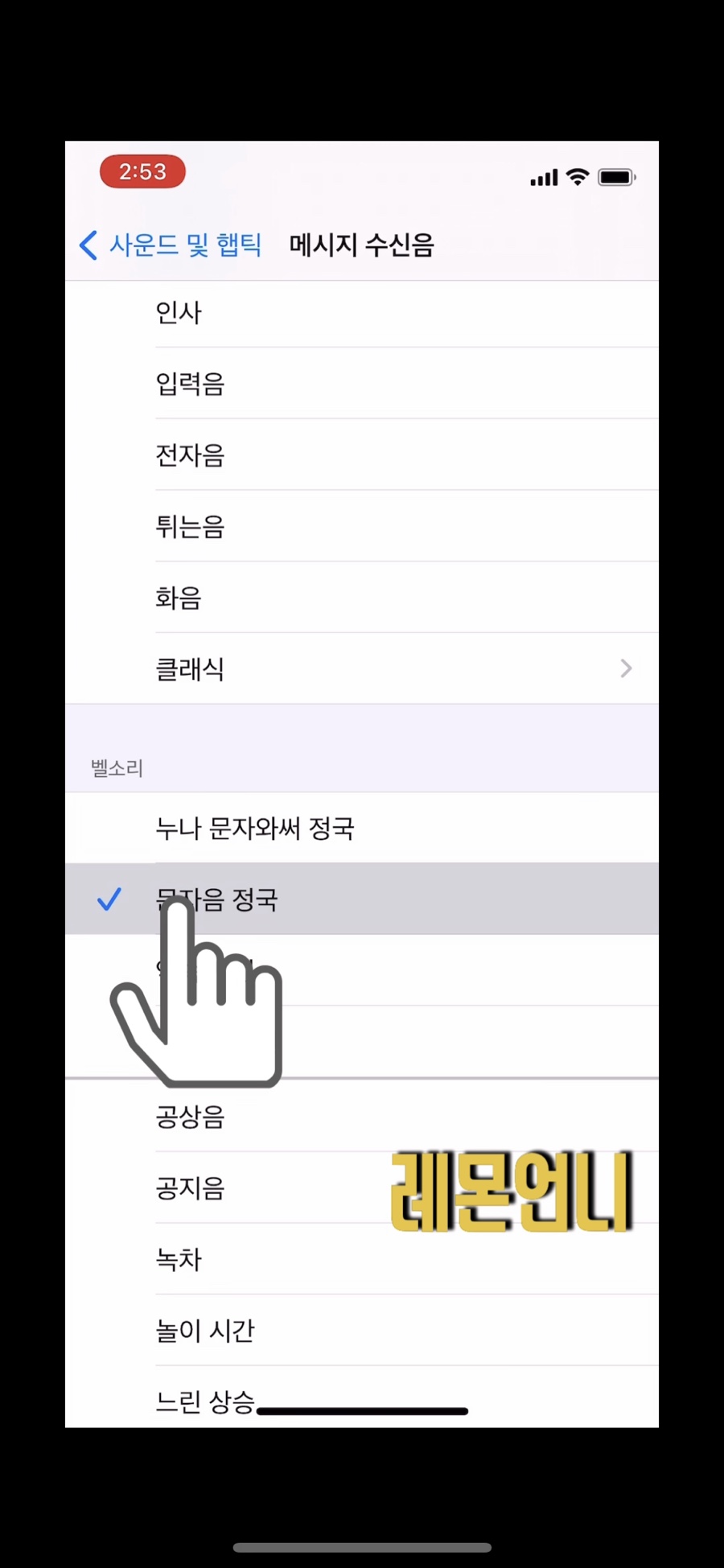 여기서 벨소리와 메시지 수신음 설정이 가능합니다.저는 미리 <언니 글씨와 함께 정국>으로 해놨는데 포스팅용으로 보여드리기 위해 새로 만든 <문자음 정국>으로 재설정을 해보겠습니다.