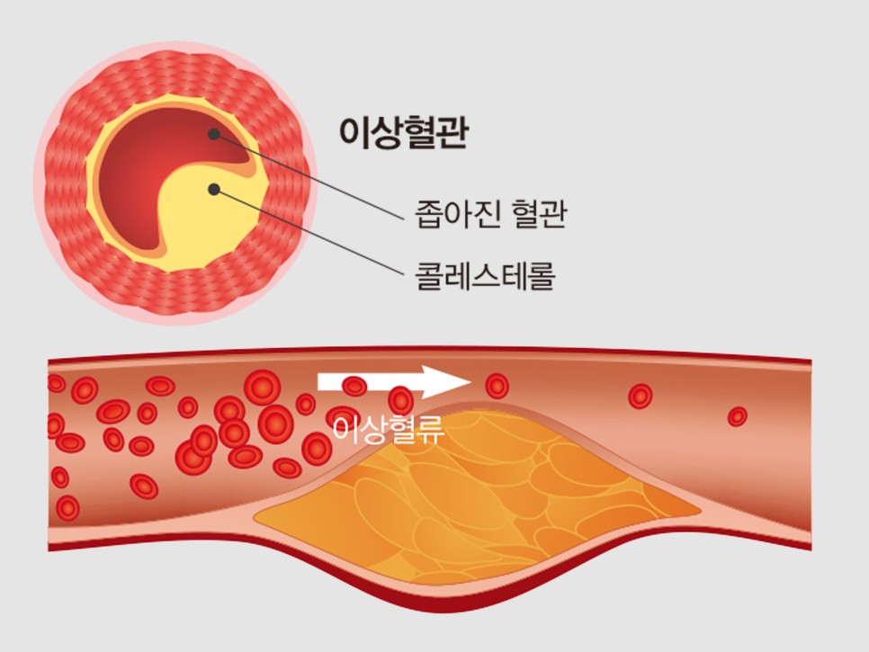 동맥 경화의 원인은 여러 가지가 있지만, 대표적으로 이상 지질 혈증이라고 불리는 고지혈증이 있습니다. 고지혈증은 혈액에 포함된 지질 성분이 비정상적으로 증가한 상태를 말하며, 건강검진 항목인 이상지질혈증(콜레스테롤, 중성지방) 수치로 진단됩니다.