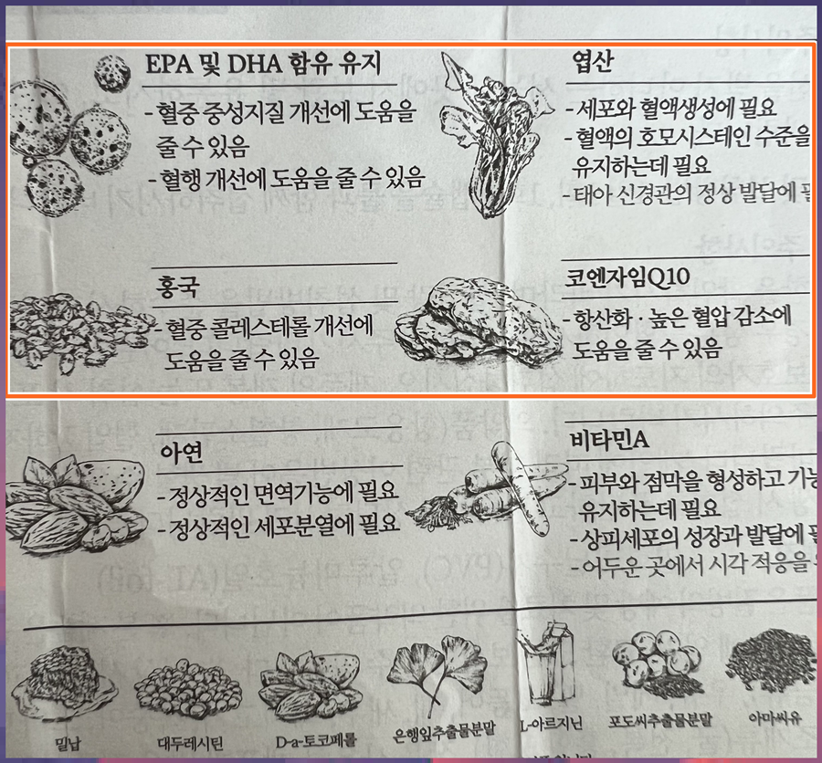 그래서 저는 혈압개선에 좋은 코큐텐 중성지방과 혈류개선에 좋은 오매가 3콜레스테롤 개선에 좋은 것으로 알려진 홍국혈액 생성에 도움을 주는 엽산, 이렇게 4가지 주원료의 조합으로 지금까지 구매해 왔습니다.여러분들도 안 되더라도 이 네 가지 원료가 최소한 있는지 확인해 보는 게 좋습니다