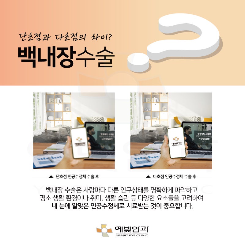 백내장 수술 시 탁해진 기존 수정체를 제거한 장소에 삽입되는 인공수정체는 크게 단초점, 다초점으로 나뉘었습니다. 단초점 렌즈는 근거리와 원거리 중 하나를 선택하여 초점을 맞추는 방법이지만 개선 후에도 돋보기나 안경을 착용해야 했습니다. 반면 다초점 인공수정체는 근거리와 중거리 모두에 초점을 맞출 수 있어 보다 넓은 시야 확보가 가능해 노안, 백내장을 한번에 해결하는 데 효과적이었습니다.
