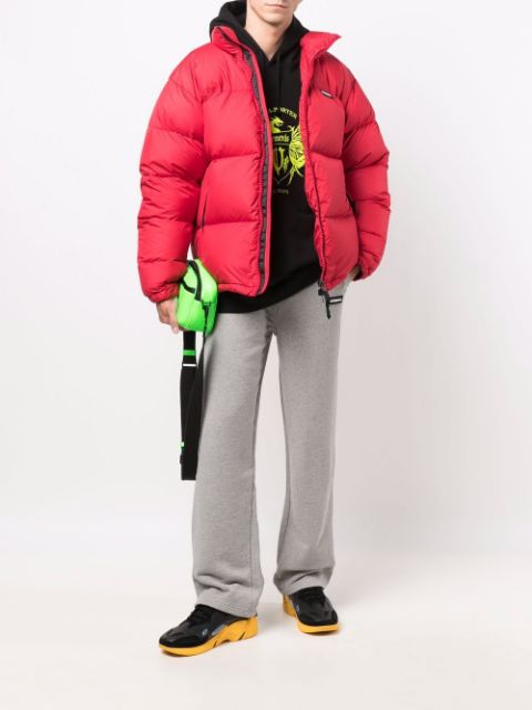 VETEMENTS 로고 프린트 패딩 숏컷 전부 남여공용 제품에서 나온 것처럼 남녀모델이 다 입고 있네요 기본스타일 숏패딩 넥 뒷면에 로고가 있어요.