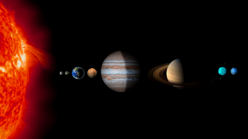크기가 큰 순서대로 나열하면 목성 – 토성 – 천왕성 – 해왕성 – 지구 – 금성 – 화성 – 수성 순