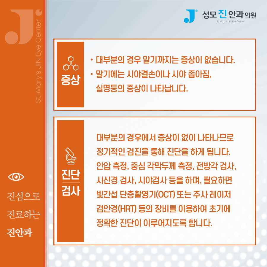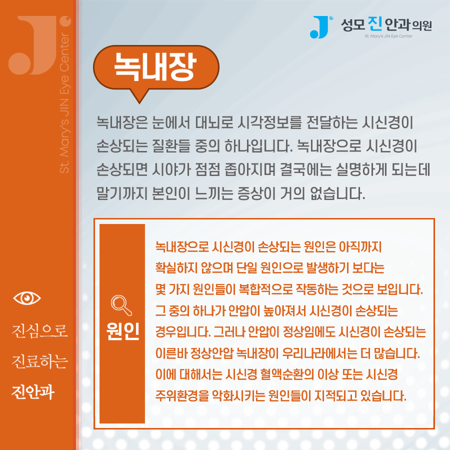 아직 제대로 된 원인은 명확하지 않지만 크게 영향을 준다고 알려져 있는 것은 2가지 있습니다. 안압 상승에 의한 시신경의 손상과 혈류장애입니다. 안압이 높으면 신경을 눌러 자극합니다. 이 과정에서 시신경이 쉽게 손상되어 눈 내부에 영양분을 공급하는 방수순환을 방해하기도 합니다. 그래서 안압 상승에 영향을 미치는 다른 기저 질환이 있다면 특히 조심해야 합니다. 고혈압, 당뇨, 심혈관 이상, 고도 근시가 있으면 발병률이 높아질 수 있으므로 주기적인 검진이 필요합니다.