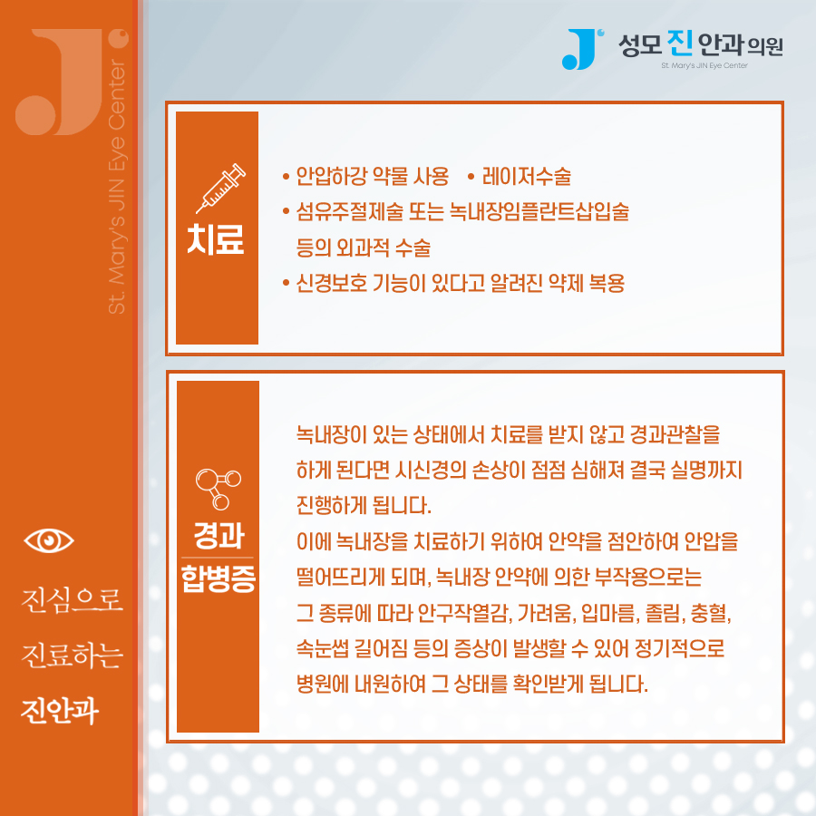 이렇게 좋아진 후에는 홍채절제술을 하거나 섬유주절제술, 녹내장 레이저 수술이 필요할 수도 있습니다. 이때의 목적은 손상된 시신경을 회복하는 것이 아니라 안압을 조절하기 위한 것입니다. 손상 부위는 회복하기 어렵기 때문에 빨리 대처해도 시야 결손이 났을 확률도 높습니다. 그러므로 가능한 한 문제가 발생하지 않도록 평소에 미리 질환의 유무를 판단하여 관리하는 것이 중요합니다.