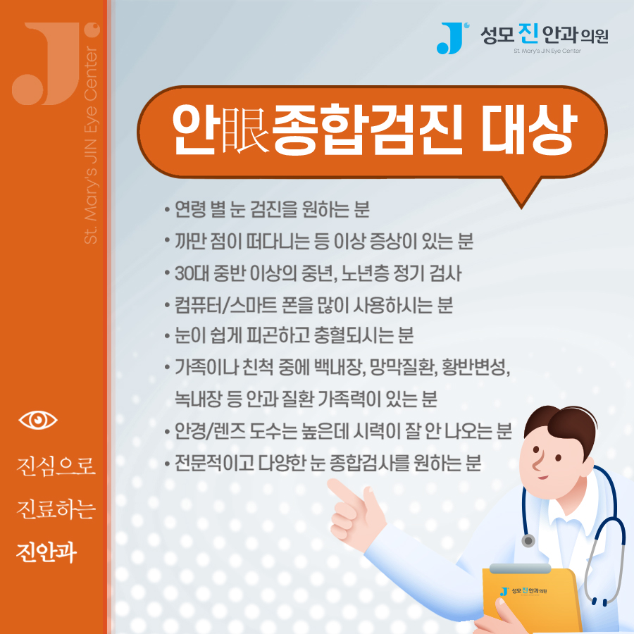 연령과 함께 유병률이 증가하므로 만 40세 이상이면 더 세세하게 검사 주기를 맞춰 주십시오. 우리의 눈은 매우 섬세하고 민감한 기관으로, 그만큼 여러 요인의 영향을 받기 쉽고 상태가 나빠지는 속도도 빠른 편입니다. 녹내장 레이저 수술을 받아도, 손상을 입은 부분은 회복할 수 없습니다. 그 반면 자각 증상이 없는 것이 대부분이므로 관리가 더 엄격해질 수밖에 없습니다. 눈이 조금 흐릿해지는 것, 피로감이 심해지는 것, 건조해지는 것 등 누구나 경험할 수 있는 일이라고 생각하지 마시고 어떤 질환의 전조증상이 아닌지 한번 체크해 보시기 바랍니다.