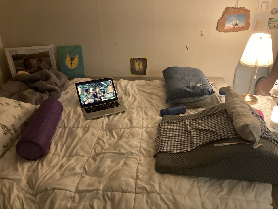 침대 위 준비물 : 베개 전기 카펫 노트북 너구리