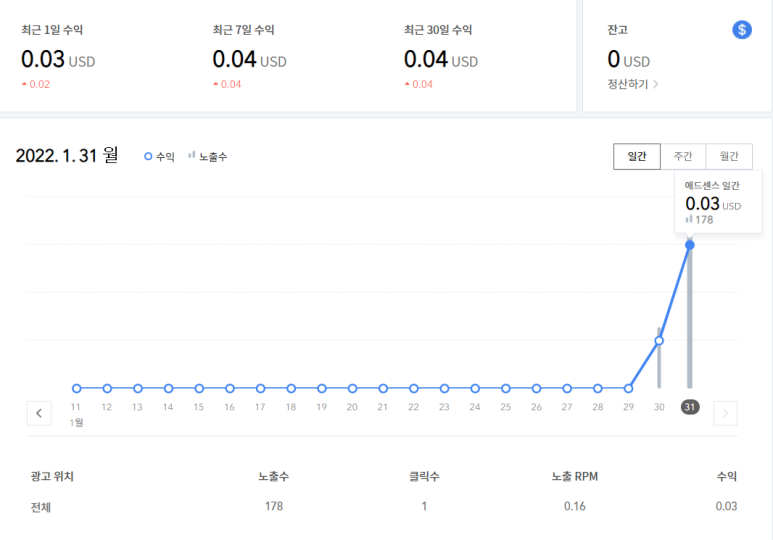 오~ 신기하네요30일부터 갑자기 수익이 약간 발생하기 시작했어요 댓글이 누적돼 방문수가 늘어나면 수익도 함께 늘어나겠죠.~희망을 가져보겠습니다.