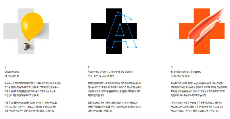 원하는 스마트폰 종류와 케이스 디자인 선택 후 제작 가이드에 따라 케이스 색상 선택부터 텍스트 추가와 직접 만든 이미지, 사진 등록 등 다양한 디자인 요소를 손쉽게 이용하면 3분 만에 나만의 상품 제작이 가능합니다. 디자인 작업이 완료된 상품은 네이버페이 등을 이용해 바로 구매까지 가능하다는 장점을 가지고 있습니다.