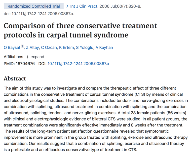 이 연구에 따르면 수근관 증후군을 앓고 있는 28명의 여성 환자에게 연구해 보았다고 합니다.부목, 신경가동운동 or 초음파치료, 부목 or 초음파, 부목, 신경가동운동 등 3가지 치료결과 8주 후 세 그룹 모두 치료적 효과가 나타났다는데.장기간 환자 설문조사 결과 초음파 첨목신경 가동 운동 3개 모두 한 그룹에서 효과가 가장 좋았다고 합니다.뭐든 많이 하면 되나 봐요물리치료적으로 볼 때, 각 영역에서의 최선의 치료가 환자에게 가장 크고, 제대로 된 치료효과를 얻을 수 있다고 생각합니다.
