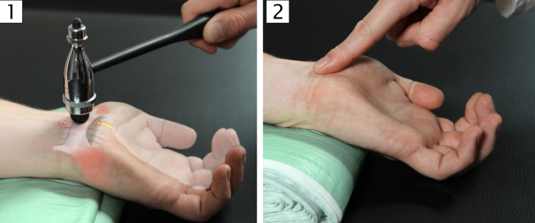또한 손바닥 쪽 손목에 기구나 손가락으로 톡톡 쳤을 때 손바닥이나 손가락에 증상이 나타나면 양성입니다.