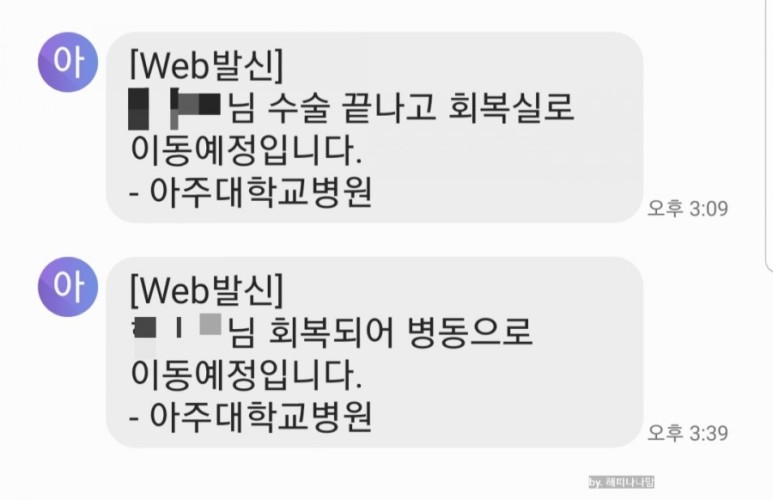 병원에서 수술 종료 후 보호자 휴대폰으로 문자를 발송합니다.