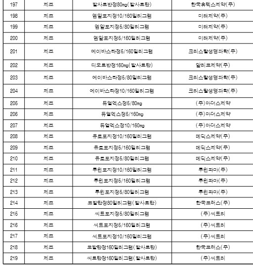 식품의약품안전처 판매중지, 단종 219개 제품 목록